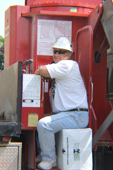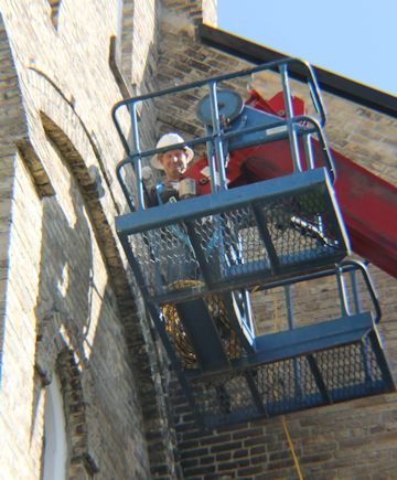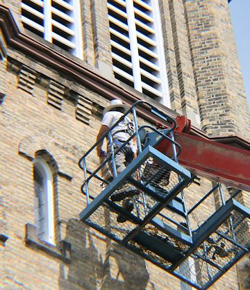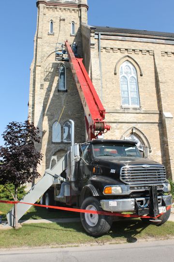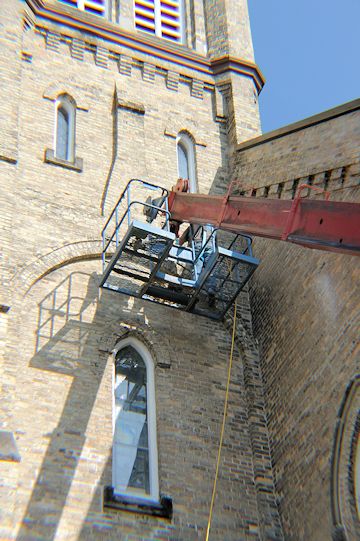 Standing on a lift, courtesy of a boom truck from Bruce Cranes of Ripley, the Farrells were removing the bad bricks and repointing the remainder, similar to work they had done along the east side of the church.