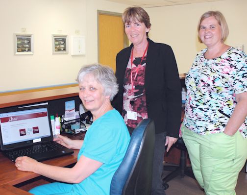 RPNs Waltraud Uebelhoer (L) and Leanne Edwards (R) developed the interactive web‐based wound care assessment tool at the South Bruce Grey Health Centre's Durham hospital site; with them, is Maureen Rydall, director of patient care at the Durham and Chesley sites; photo courtesy of the South Bruce Grey Health Centre