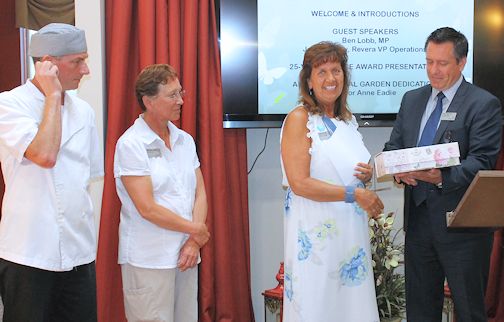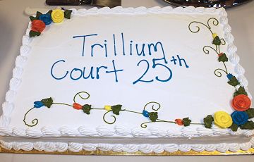 Trillium Court opened on July 16, 1990, said executive director Terri Schuler. She welcomed everyone to the 25th anniversary celebration, and with John Beaney, vice-president of operations for Revera, presented 25-year service awards to employees Debra Kraft, Brenda Jolley and Rick L'estrange; Diane Bath and Georgette Durrant were absent.