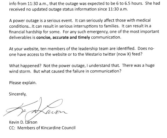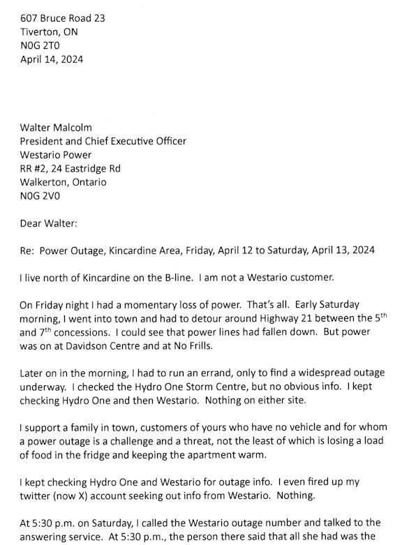 I sent a letter of concern to Westario Power on failed communication. I also contacted Kincardine council, including council’s representative on the Westario Power board of directors. I understand that he will bring up the issue of the need to improve communications at the next Westario Power board meeting.