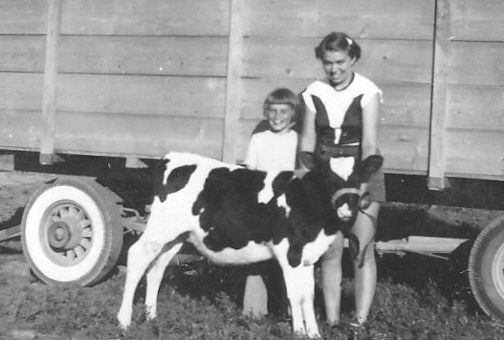 In the photo below, Gail and I are showing off “Lulu,” my first calf. I don’t remember, and Mum’s diary doesn’t tell me, whether she was born on the farm or whether we purchased her. It does say, however, that we got first prize at the Kincardine Fair and that we stood in the ring for two hours in Teeswater.