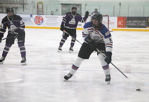 Caeleb Bowler (centre) of the Bulldogs moves the puck over the Penetang blueline
