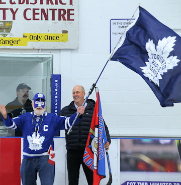 As usual, Davidson had his face painted blue-and-white, was sporting a Maple Leafs hat and jersey, and waving flags for both the Leafs and the Bulldogs, demonstrating his enthusiasm for the game of hockey, the Municipality of Kincardine, and his beloved Davidson Centre. Joining him, for the opening ceremony, were Huron-Bruce MP Ben Lobb, MPP Lisa Thompson and Kincardine mayor Kenneth Craig.