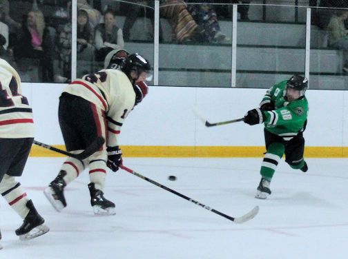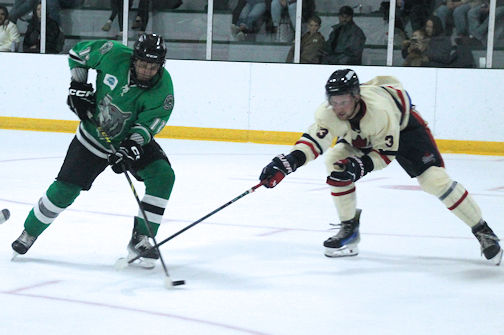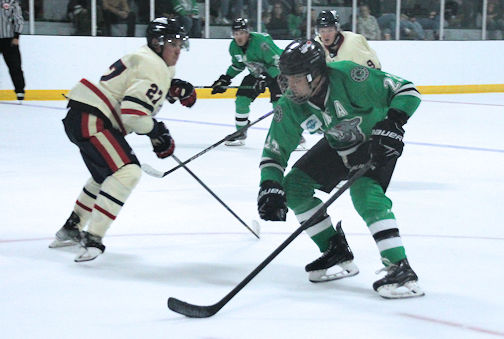 Dan Nicoloff (left) of the Ripley Wolves gets the puck past the Elmvale defence