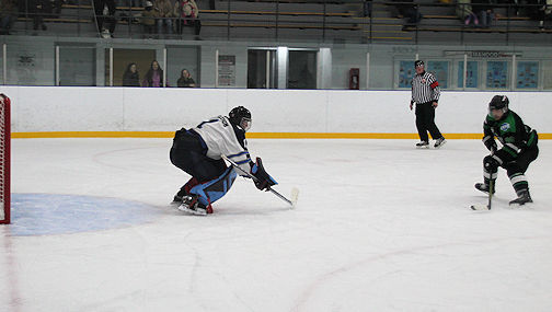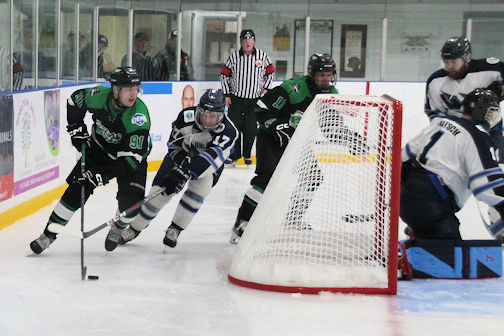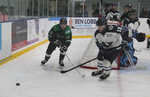 Cody Britton (right) of the Wolves tries to out-maneuver the Saugeen Shores goaltender