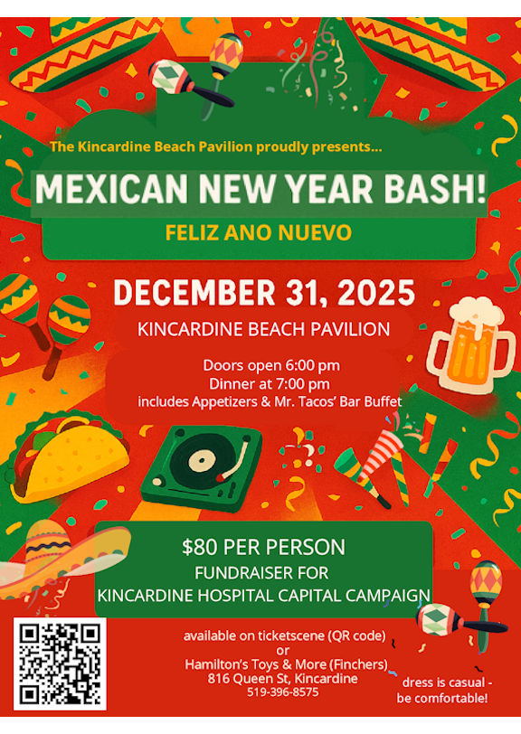 Ring in 2026 at the New Year’s Eve Mexican Fiesta fund-raiser, hosted by the Kincardine Beach Pavilion, in support of the Kincardine Hospital capital campaign