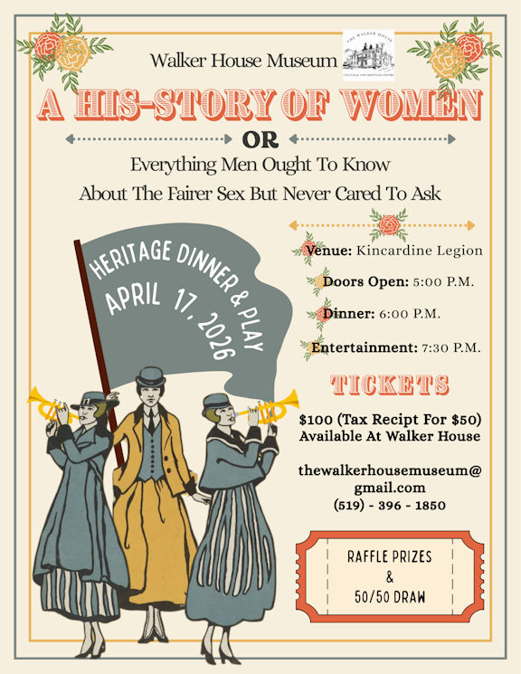 Everyone is welcome to the annual Walker House Heritage Dinner, Friday, April 17, at the Kincardine Legion, featuring the drama production, "A His-Story of Woman: Or Everything Men Ought to Know About the Fairer Sex (But Never Cared to Ask)."