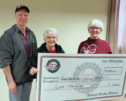 Nan Grant (right) of the Kincardine Food Bank accepts a donation of $1,000 from organizers of the Formosa Country Christmas
