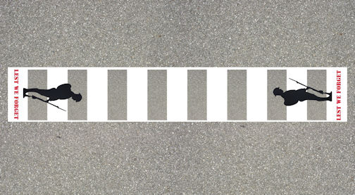 The design (below) will feature two soldiers on a backdrop of white and grey stripes, with the words “Lest We Forget” in red at each end of the crosswalk.
