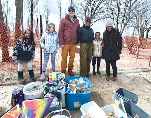 A group of volunteers stands with the pile of litter collected during the clean-up of Station Beach, Kincardine, Sunday afternoon