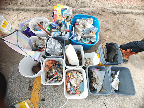 Buckets full of trash and recyclables gathered in the clean-up