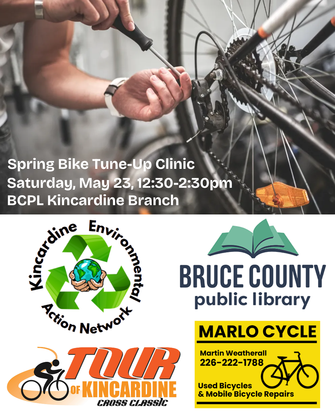 KEAN is also hosting a Bike Tune-up Workshop, Saturday, May 23, from 12:30-2:30 p.m., outside the Kincardine Library. Bring bikes to be tuned up for the season. Sign up here: www.signupgenius.com/go/10C054EACA82EA0FAC70-62682008-spring.