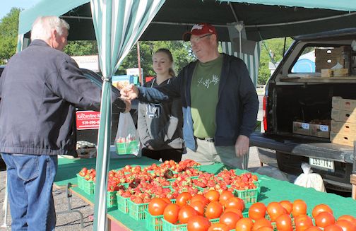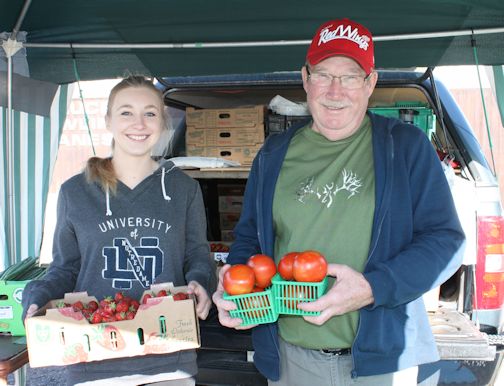 John Powers of Chepstow, and his assistant, Sean Creces of Kincardine, were serving customers, as the fruit and vegetable stand opened for business Saturday morning at Bruce Bowling Lanes in Kincardine.