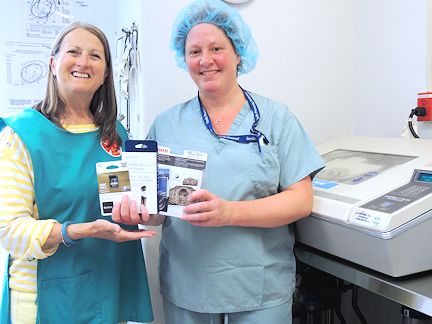 Below, Kincardine hospital auxiliary president Ginny Ross gets a look at the new items, assisted by Darlene Kraemer, in the reprocessing department