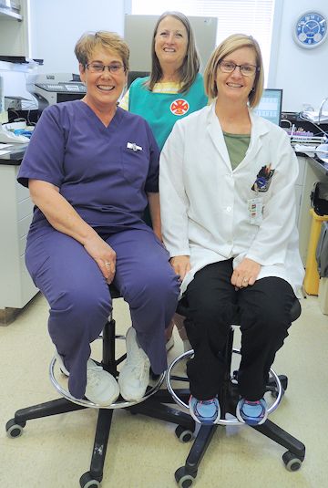 Kincardine hospital auxiliary president Ginny Ross (C) admires the new chairs in the Laboratory at the hospital; seated, are Lynn Taylor (L) and Karen Mangotitch; photos by Liz Nurton