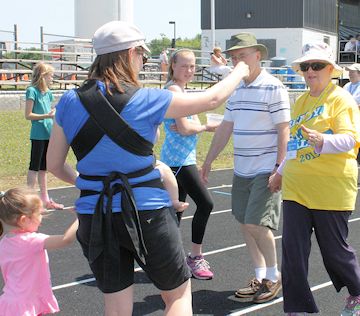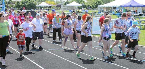 Besides walking the track, the event featured local entertainment, theme laps, a kids' zone, and at 7 p.m., the cancer survivors walked their victory lap behind the Kincardine Scottish Pipe Band.