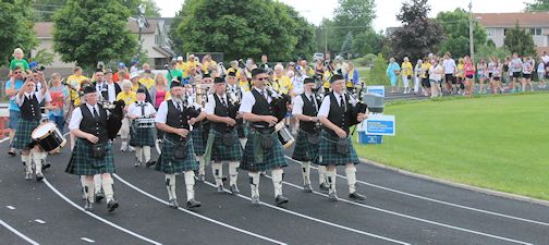 The Kincardine Scottish Pipe Band leads the cancer survivors in a victory lap at the Kincardine Relay for Life, Saturday evening at the Davidson Centre track