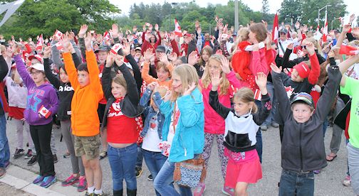 A huge crowd of adults and children gathered at the flag pole where MC Mike Walsh welcomed them for the 50th anniversary of the Canadian flag, and the 148th birthday of Canada.