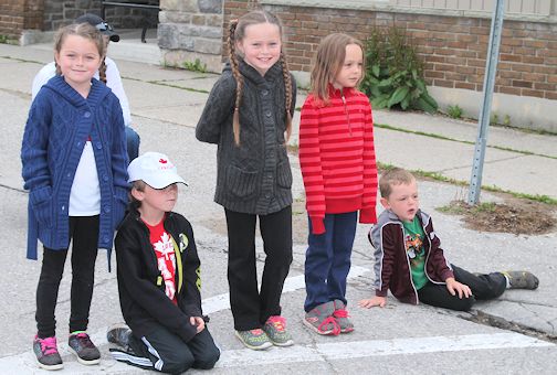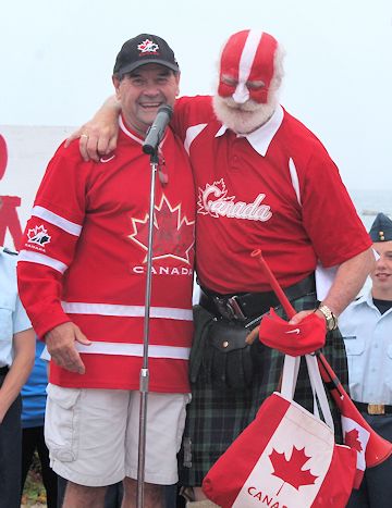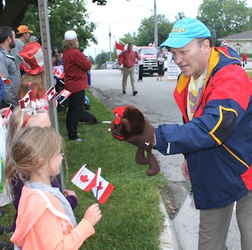 The Kincardine Scottish Pipe Band led the parade, followed by the Kincardine Legion Colour Party, members of the Legion, the Kincardine Air Cadets carrying a Canadian flag "Olympics-style," Kincardine mayor Anne Eadie, "Captain Canada" Brad Kirkconnell, Huron-Bruce federal Liberal candidate Allan Thompson and his family, entertainer Robert Davis, and the Montgomery Ford Midget girls provincial championship hockey team.