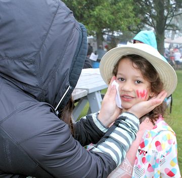 Keith Davidson (R), former recreation director and full-time cheerleader of Kincardine, arrived with his face painted red and white, and a bag of props, ready to take the microphone as the guest speaker.