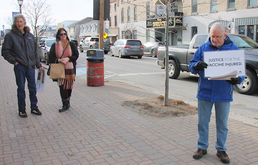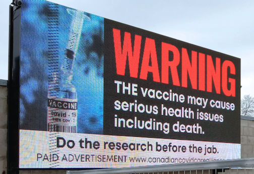 This sign can be found at the main intersection in Hanover, warmingn people that the COVID-19 vaccine may cause serious health issues, including death; photo by Carol Blake