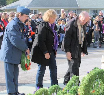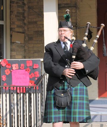 Outside, in front of the Cenotaph, wreaths were placed, until 11 a.m, when the crowd sang "O Canada," bugler Ray Kester played "The Last Post," there were two minutes of silence, piper Jennifer Farrell played "The Lament," and Kester played "Reveille." The remaining wreaths were placed, and the service ended with the singing of "God Save the Queen."