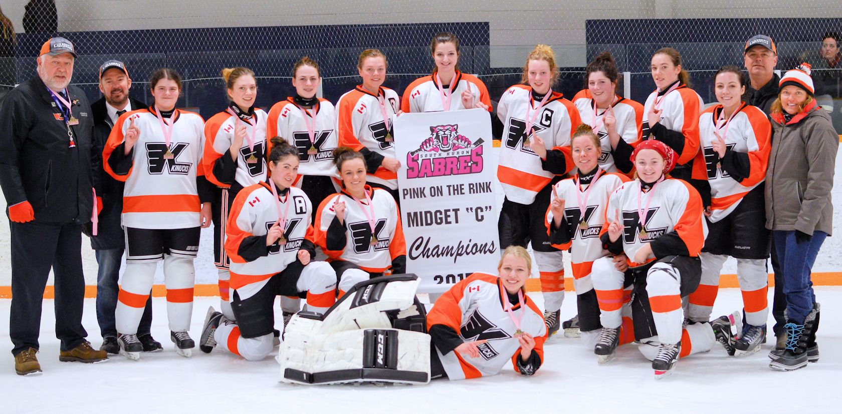 The Kincardine Montgomery Ford Midget girls "C" team had a busy and rewarding weekend, bringing home the championship banner from the 2015 “Pink on the Rink” South Huron tournament held in the Exeter/Hensall/Zurich area.