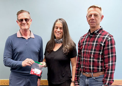 Rev. Dan West (left) and Wade Gibson (right) of Knox Presbyterian Church, Kincardine, present tokens for the Kincardine Good Food Box program to Julie Sharpe of Community Living of Kincardine and District; photo courtesy of Kincardine Community Living