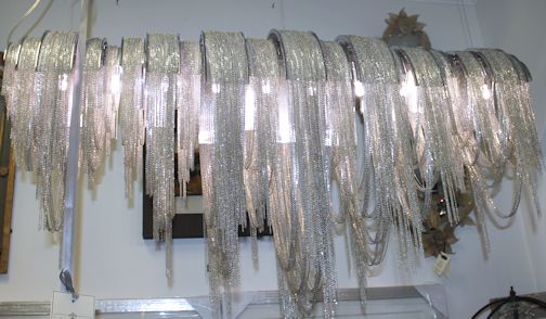 Hanging just inside the door, is a stunning chandelier, a reproduction of a $20,000 mid-century design by Terzani, an Italian designer of light. The shimmering nickel-coloured iron chains recall the classic beauty of an evening gown, creating a truly unique piece that is both timeless and modern. Several kilometres of delicate chain are painstakingly looped and draped from metal bands, creating this dynamic chandelier that appears to be made of a shimmering fabric that can appear to take on new forms as the viewer moves around the room. True jewellery for your home!