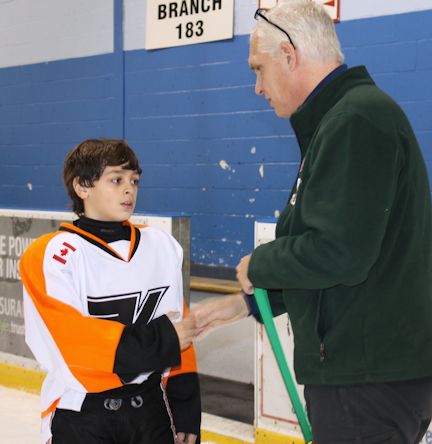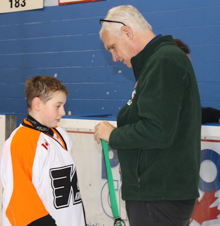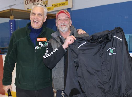 Just prior to the Peewee "B" final game, tournament director Ray Luinstra presented a Silver Stick jacket to Craig Whitfield of Kincardine, an employee at the Davidson Centre for 31 years, who has worked every Kincardine Regional Silver Stick tournament since the event began. Whitfield is considering retirement but would definitely be back for Silver Stick.
