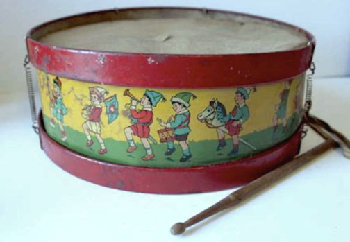 Drums and tops were favourite toys for boys. There were lovely big tin tops in bright metallic colouring. The handle went up and down to wind them. They spun around and around making a musical humming sound.