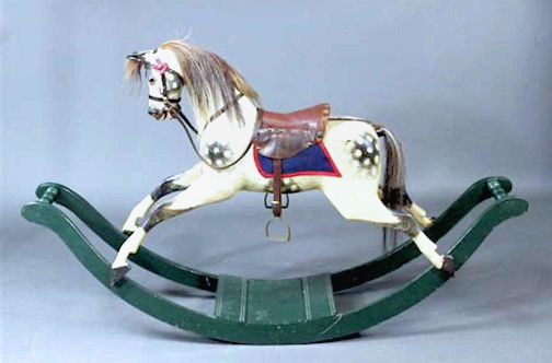 Little boys played with beautiful rocking horses, either one large horse astride his rockers with stirrup and saddle, or two horses with a seat between them for a smaller child. Then there was the Gee Horse — a stick with a horse head on the end with a strap from the mouth for the child to hang onto. The child ran with the stick between his legs. Some sticks had a wheel on the end, and some were just a plain stick, but the gallop was enjoyed just the same.