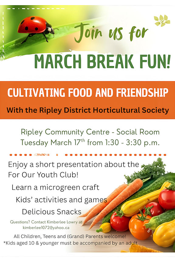The Ripley and District Horticultural Society welcomes children, teens, parents and grandparents to the March Break Fun event, "Cultivating Food and Friendship," Tuesday, March 17, from 1:30-3:30 p.m., in the social room at the Ripley-Huron Community Centre.