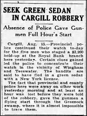 The newspapers don’t say so, but the tip-off to border police probably came from OPP officer Otto McClevis. Although he arrived in Cargill an hour after the bank job, he was able to interview the many witnesses.
