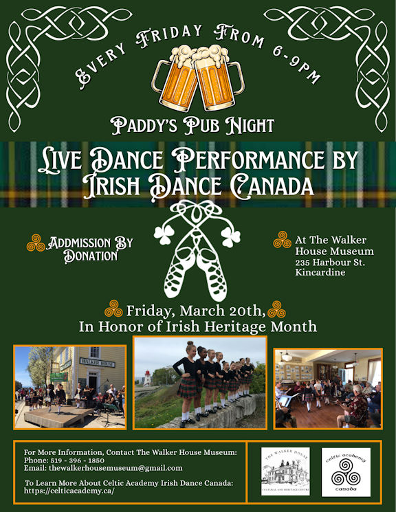 Celebrate Irish Heritage Month during a special edition of the weekly Pub Night, Friday, March 20, from 6-9 p.m., at the Walker House in downtown Kincardine.