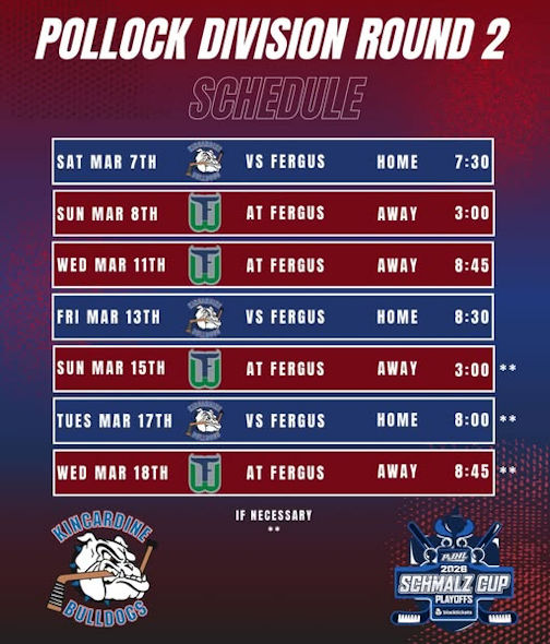 If necessary, Game 5 runs Sunday, March 15, in Fergus at 3 p.m.; Game 6 is in Kincardine, Tuesday, March 17, at 8 p.m.; and Game 7 runs Wednesday, March 18, in Fergus at 8:45 p.m.