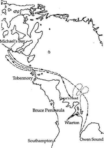 The next four days were spent trying to break the "Prince Alfred" from her frozen prison, but to no avail. In the meantime, the frustrated MPP Lyon took a small boat, intending to cross over to Manitoulin. He got as far as Cove Island then, judging the rest of the voyage too hazardous, gave up. With no possibility of getting out on the "Prince Alfred," Lyon started south by land and on the 13th, after a two-day trek, reached Owen Sound. On the 15th, he arrived in Gravenhurst by train, then Parry Sound by stagecoach. Ahead lay a journey by dog-team, horse-drawn sleigh and on foot, through Collins Inlet, Killarney, Manitowaning and finally home to Michael’s Bay, on the 21st.