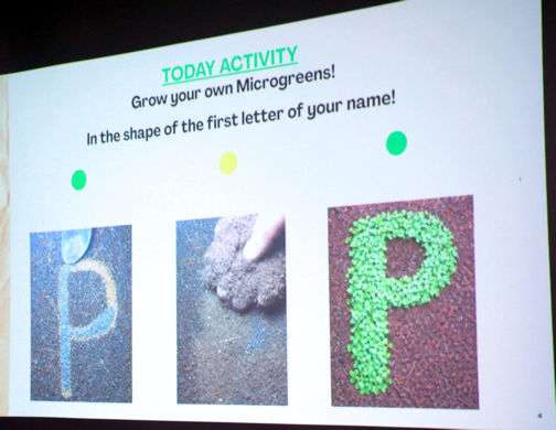 The seeds will become broccoli micro-greens, tender immature broccoli plants which are harvested one to two weeks after planting and are very nutritious. Both soil and seeds were generously donated by Nick O’Hatten of Huron Ridge Micros.