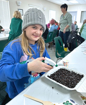 Next, Curran introduced the craft: making mini-greenhouses and planting micro-greens. Participants at the meeting either brought their own or received a shallow plastic container with a lid. Club helpers Josslynn Curran and Heather and Natalie Newman distributed soil and seeds. Using their fingers or a utensil, the participants created a trench in the shape of the first letter of their name. Seeds were added, watered and the top affixed.