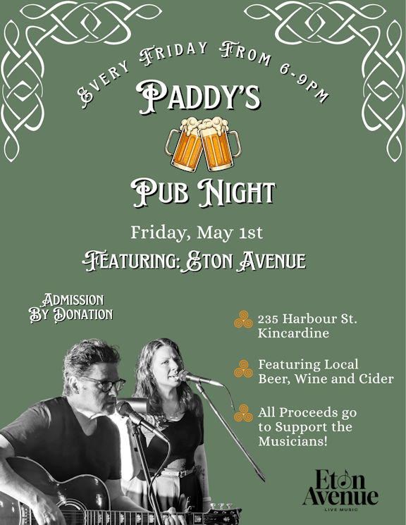 Everyone is welcome to the Walker House in Kincardine to enjoy live music from "Eton Avenue" at Paddy's Pub Night, Friday, May 1, from 6-9 p.m.
