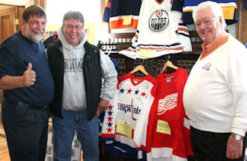 Dennis Riggin (R) with Bill Murdoch (L) and Pat Riggin at hockey exhibit in the Walker House, 2009