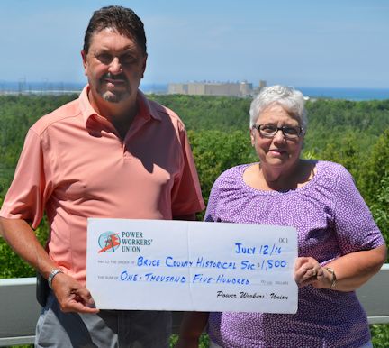 Larry Alderdice (left), sector representative of the Power Workers' Union, presents a cheque for $1,500, to Irene Howe, president of the Bruce County Historical Society; photo courtesy of the historical society