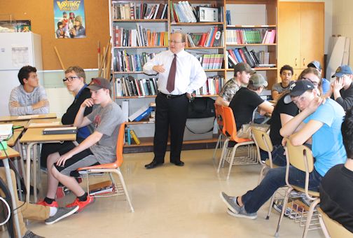 KDSS principal Mark Ozorio (centre) talks to the students in Watson Morris' Civics class, Tuesday morning
