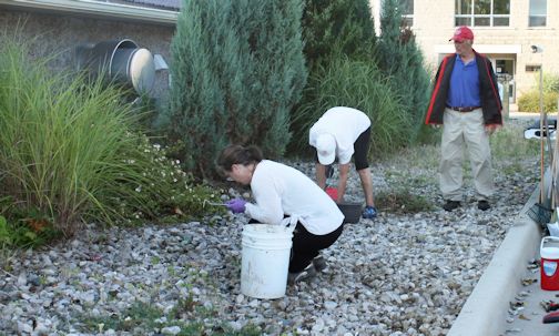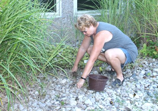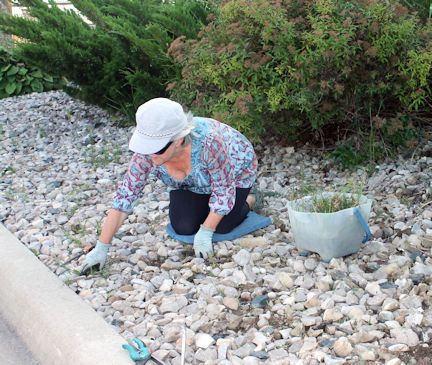 Fortunately, Stevens is not alone in her endeavours. Tuesday night, Aug. 22, she had five helpers, Lise and Ben Blais, Scott Stevens, Carole Bylsma and April Finney, working together to weed the rocks on the east side of the Kincardine Pavilion.