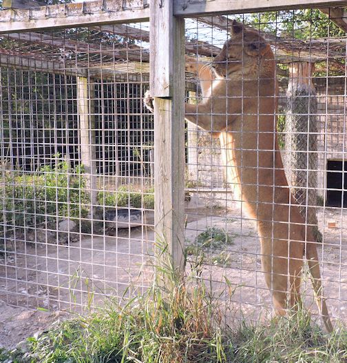 After a few more stops, the group arrived at the cages containing four lions. Geddes said the youngest lion’s name is Eve; she was raised at the Bervie Zoo. When Eve stood up on her hind legs, she was more than six feet tall.